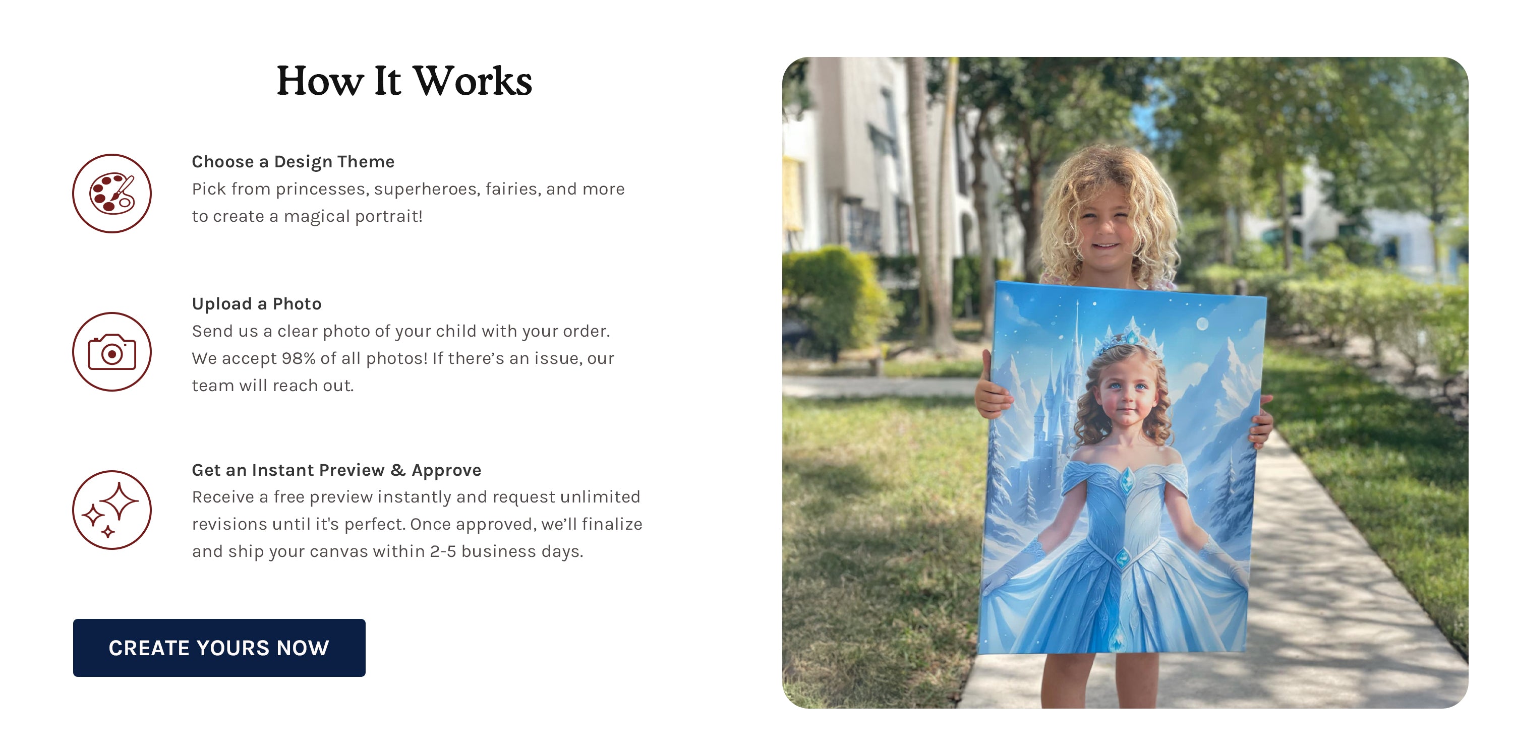 “My daughter can’t stop smiling at her princess picture. It arrived super fast, too!”— Amanda G., San Diego